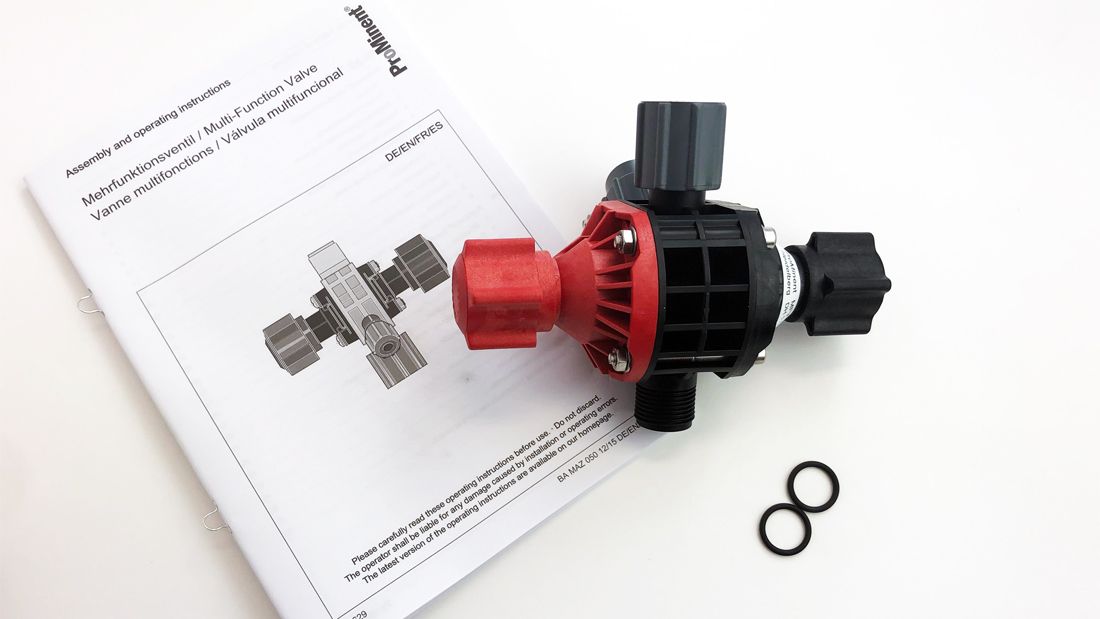 adjustable pressure: 0,5-10 bar Material: PVDF, PTFE, FKM Connection: 3x thread G 1 1/2" Connection parts for pipework or hoses are not included with this product, however, can be supplied by ProMinent at additional cost. If you require these items, please indicate this in the comments field at the checkout, and an advisor will contact you. |
