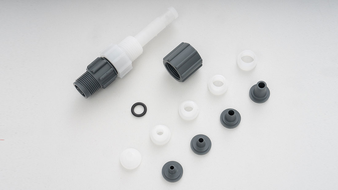 With connectors for all hose sizes used with solenoid-driven metering pumps: 6/4, 8/5, 12/9, 10/4 and 12/6.