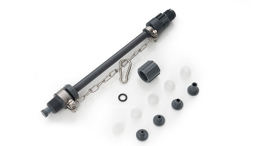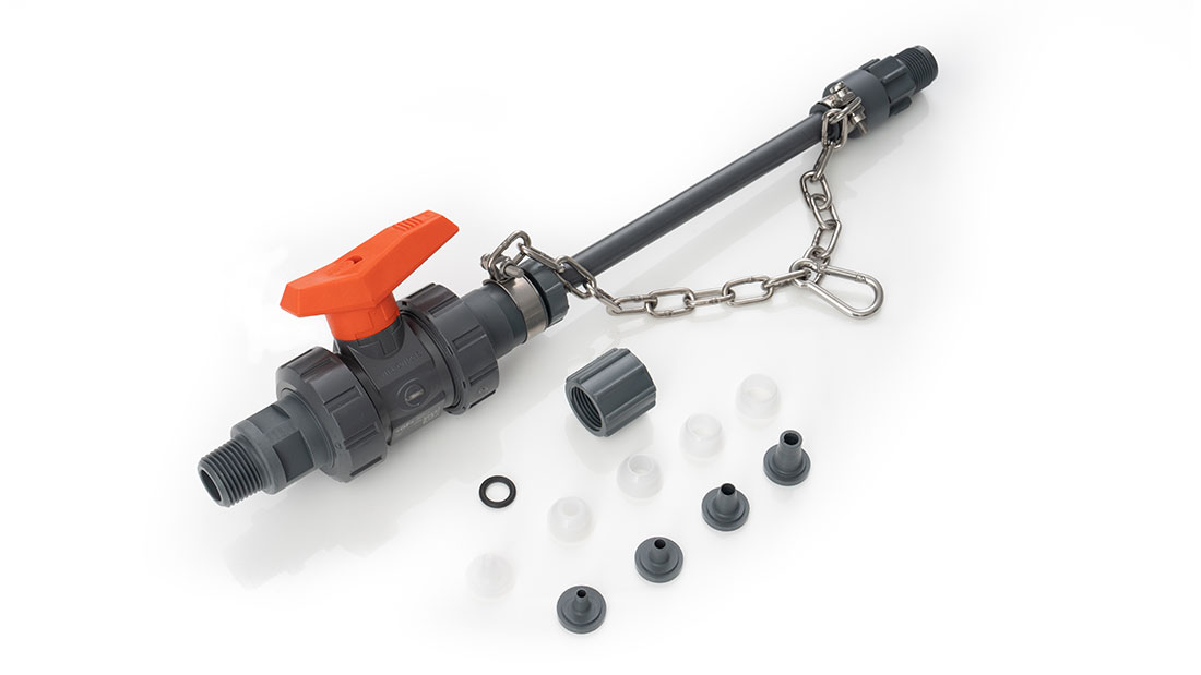 Seals: FKM/silicone Max. pressure: 6 bar Consisting of: spring-loaded metering valve, Hastelloy C spring, ceramic ball, adjustable immersion rod, hose valve. With connectors for all hose sizes used with solenoid-driven metering pumps: 6/4, 8/5, 12/9, 10/4 and 12/6. |